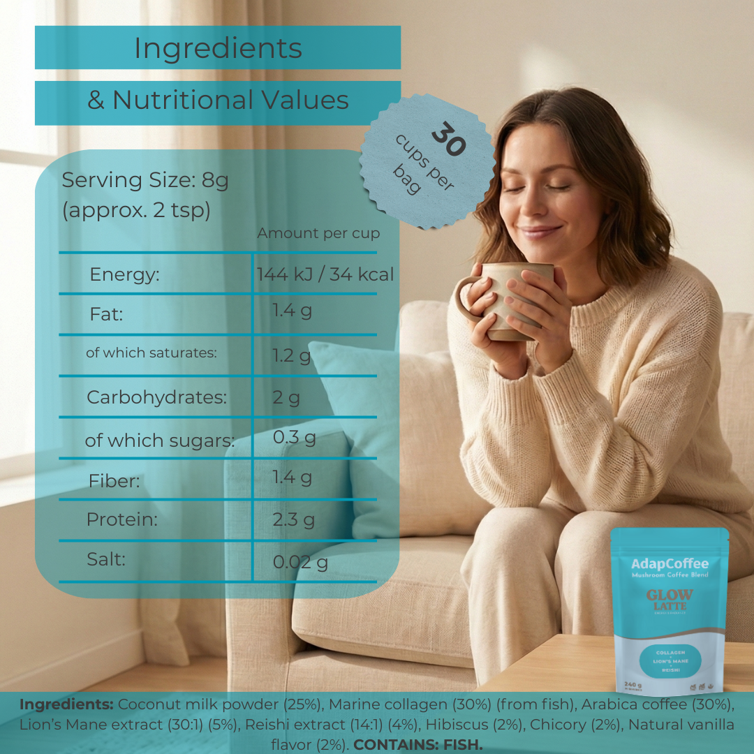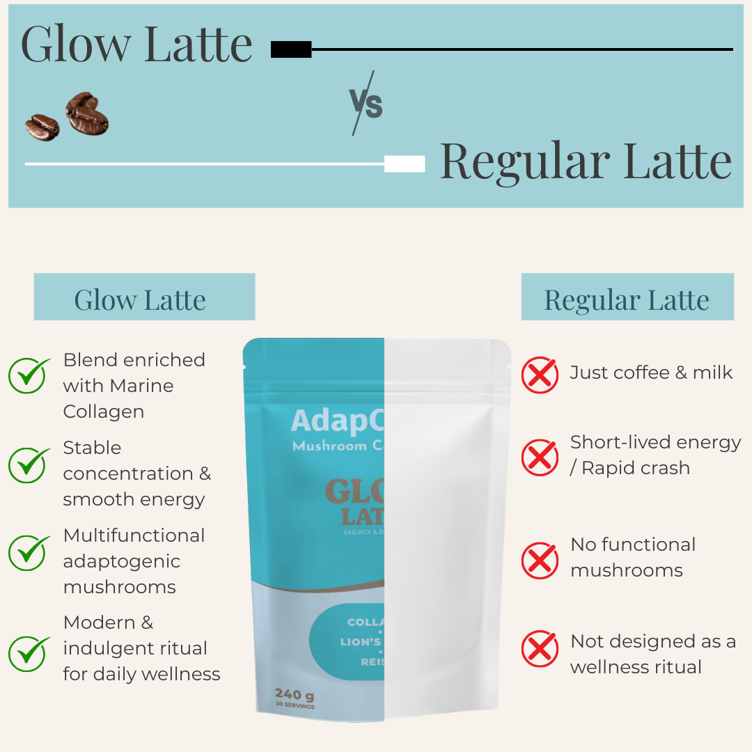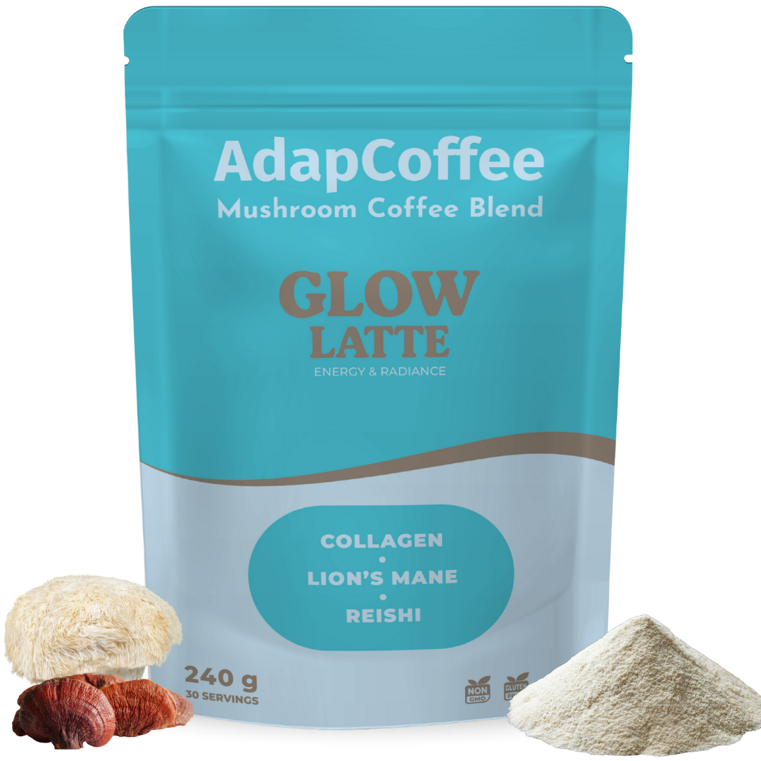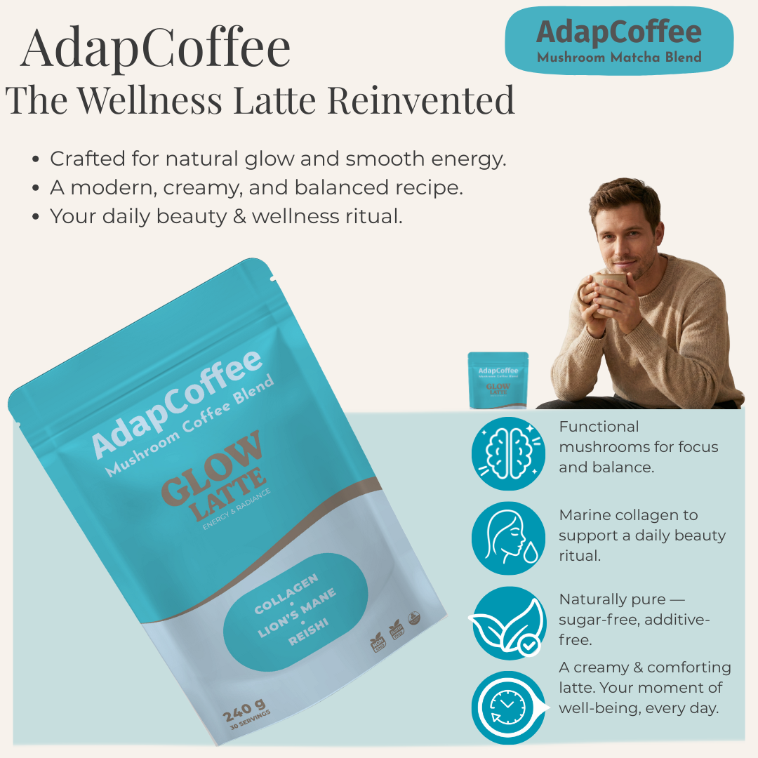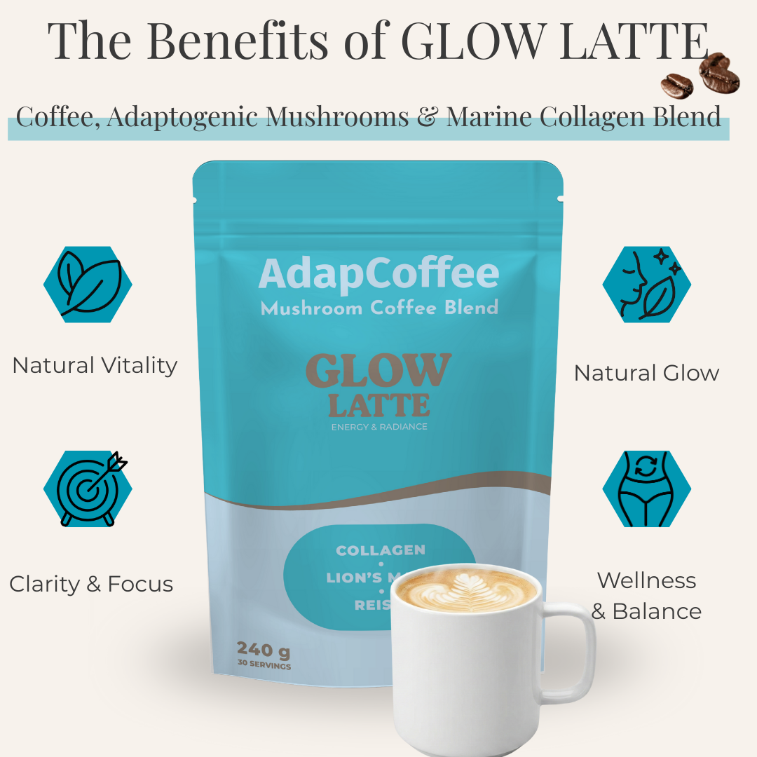 Dank der einzigartigen Kombination aus adaptogenen Pilzen, meereskollagen und natürlichen Inhaltsstoffen begleitet Glow Latte by AdapCoffee Ihren Alltag sanft und genussvoll: