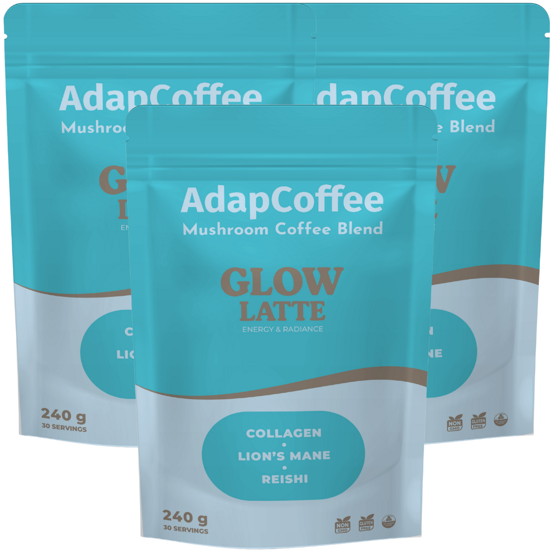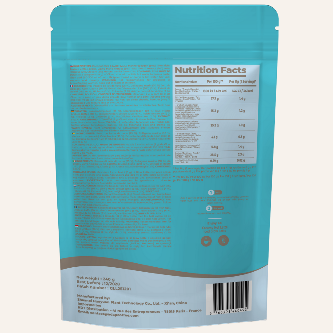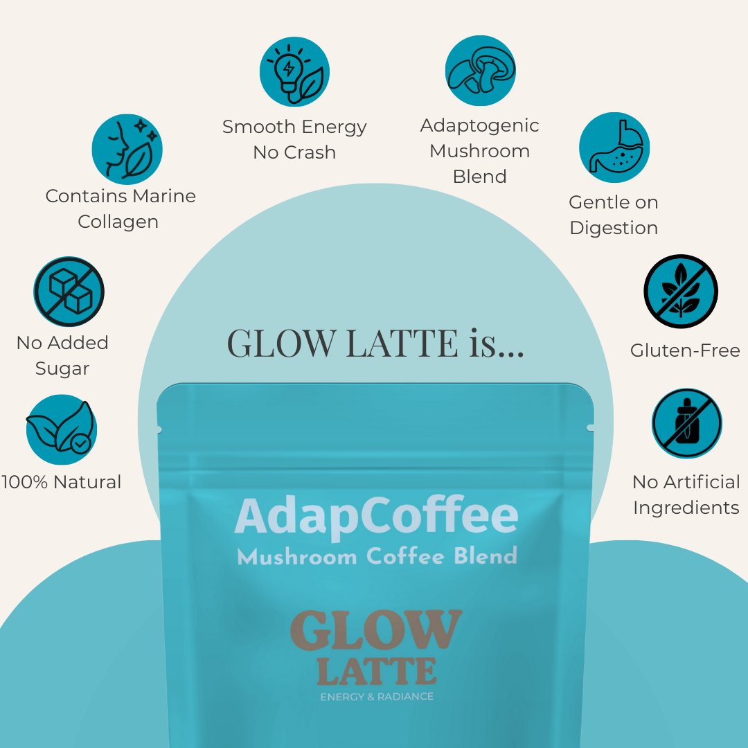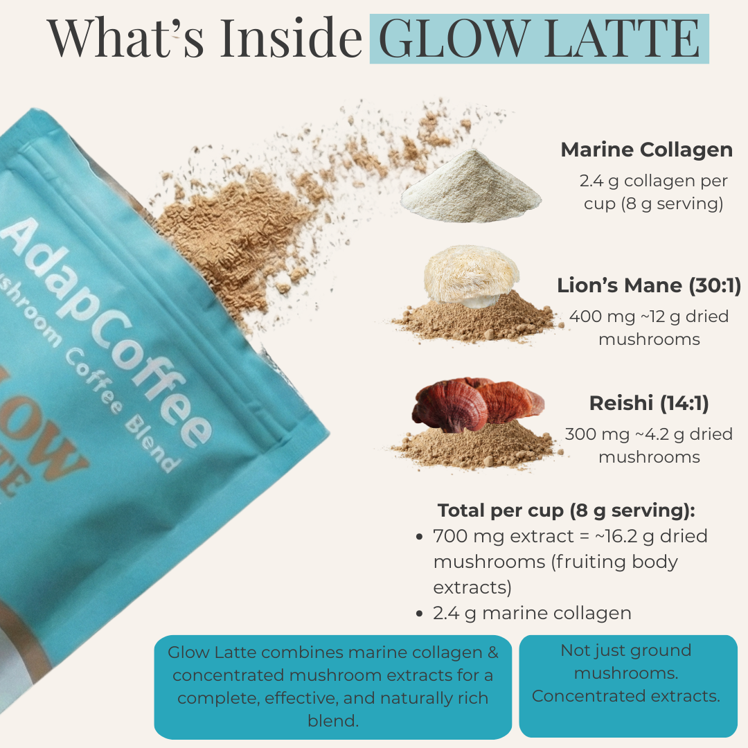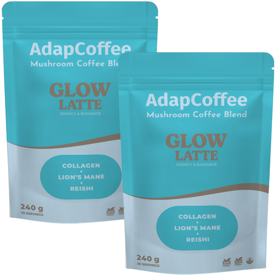 Dank der einzigartigen Kombination aus adaptogenen Pilzen, meereskollagen und natürlichen Inhaltsstoffen begleitet Glow Latte by AdapCoffee Ihren Alltag sanft und genussvoll: