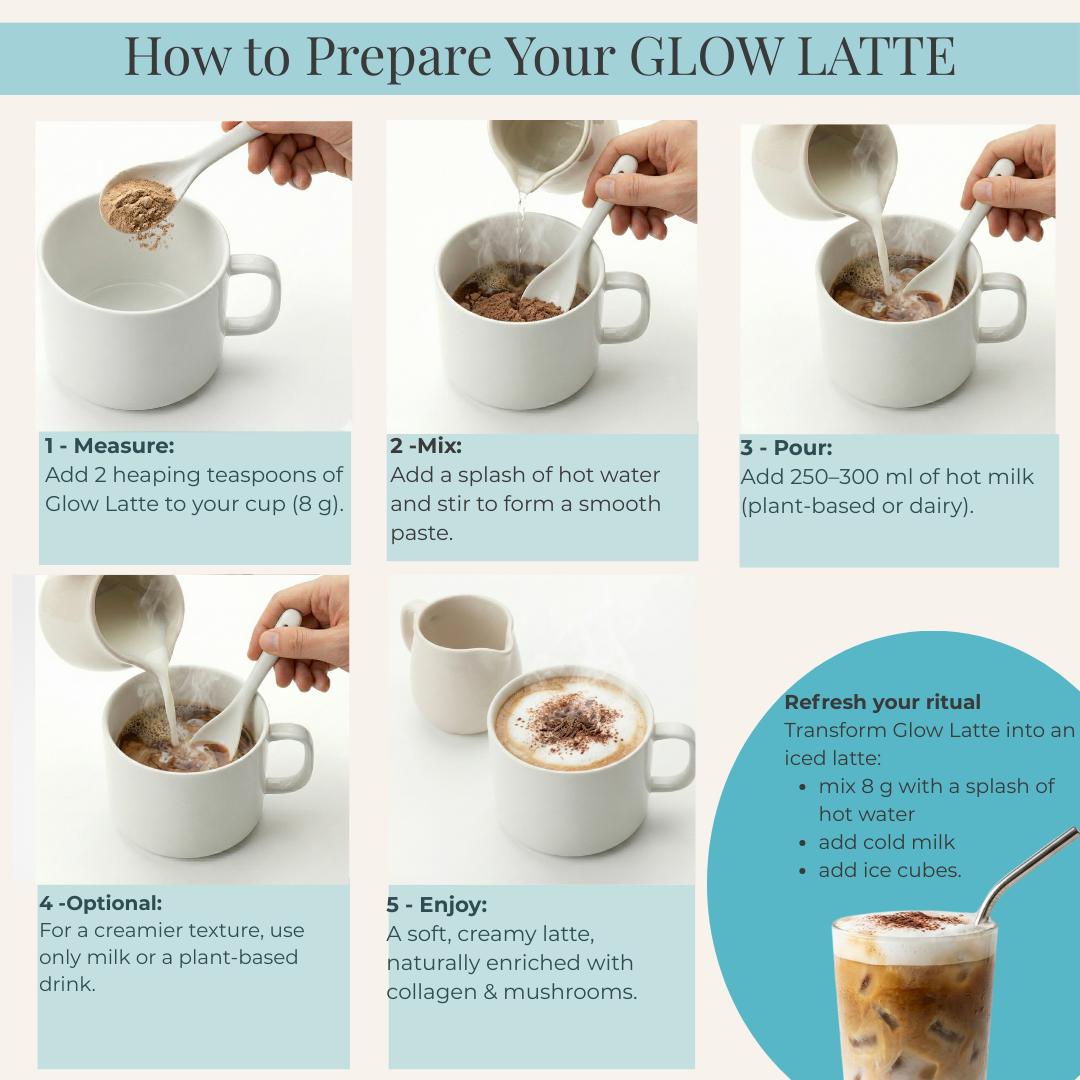 • Geben Sie 2 gehäufte Teelöffel (8 g) Glow Latte in Ihre Tasse. Gießen Sie etwas heißes Wasser auf und rühren Sie um, dann füllen Sie mit 250 bis 300 ml heißer Milch (pflanzlich oder klassisch) auf. Für eine noch cremigere Textur können Sie ausschließlich Milch verwenden. Glow Latte schmeckt auch hervorragend als Eiskaffee: Mischen Sie 8 g Pulver mit etwas heißem Wasser, fügen Sie kalte Milch und einige Eiswürfel hinzu. Genießen Sie einen milden, cremigen Latte, natürlich angereichert mit Meereskollagen und adaptogenen Pilzen.