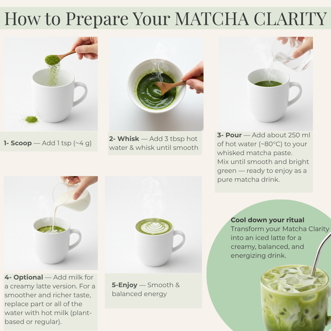 Geben Sie 1 gehäuften Löffel (~4 g) in Ihre Tasse. Gießen Sie 250 bis 300 ml heißes oder kaltes Wasser dazu – es schmeckt auch köstlich als Eistee-Version. Einfach mit einem Löffel umrühren oder einen Milchaufschäumer für eine noch cremigere Textur verwenden. Genießen Sie es pur oder fügen Sie Milch (pflanzlich oder nicht) und einen Hauch Honig, Agavensirup oder Stevia hinzu. Eine Tasse pro Tag reicht aus, um Clarity Cup zu Ihrem Lieblings-Wohlfühlritual zu machen.